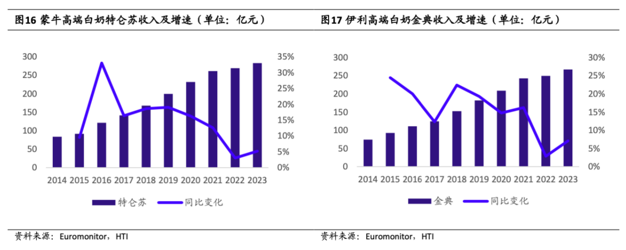 先有品質(zhì)提升,再有利潤提升。自2006年蒙牛推出了中國第一個(gè)高端牛奶品牌特侖蘇起,“高端化”便成了乳制品企業(yè)常常放在財報和公開(kāi)信息里的關(guān)鍵詞。從國內市場(chǎng)的“雙寡頭”——蒙牛乳業(yè)和伊利股份(600887.SH)的高端產(chǎn)品收入來(lái)看,“高端化”已經(jīng)是這個(gè)行業(yè)最常規的打法之一。