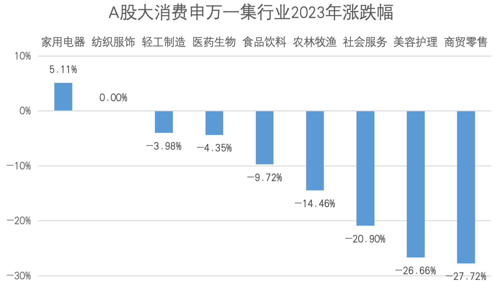 距離2023年結束還有不到兩個(gè)月,消費股已經(jīng)描繪出了大致的成績(jì)單:Wind消費指數(888013.WI)和恒生消費指數(HSCGSI.HI)年初至今分別下跌了10%和23%。其中,作為A股權重最大的板塊,食品飲料行業(yè)的表現并不出眾,表現遠遠落后于家電、紡織服飾、輕工制造和醫藥生物。